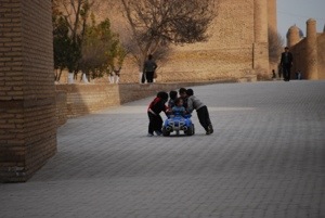 Although I cherish seeing the ancient buildings of Khiva (or, after slightly less ancient restorations, representations of the ancient buildings of Khiva), I also cherish the opportunity to walk through the neighborhoods that still reside in the city. School children played unsupervised in the streets, as there were hardly any cars. Children coming home from school tested their English on us and one little girl showed us her English language book. Women gathered together in groups while men looked under the hoods of cars. Cooking smells came through open windows. Groups of children were everywhere, playing games, running from here to there, sharing a bicycle. Cere areas of beige dirt that, to my eyes looked like waste ground were, in fact, garden plots. In which the very early spring plantings were nurtured with bottles of water. In the evening we sat on the front steps of our hotel just outside the west gate of the Dishon Qala, splitting a beer. A few steps from the shiny, scrubbed tiles of our hotel – and seemingly attached to it – was a mud-walled building. Several front doors pierced the front and there was a shared, covered front court yard that included an outdoor mud oven. While we sat there enjoying the night, a woman and a toddler emerged from one of the front doors. The two walked around the corner then returned presently with a bag of shopping. Then a man emerged with a toy tricycle. The trike was top heavy and the toddler soon tipped it over, but the man and the woman righted him and soon the man and the toddler made their way slowly through the quiet streets while the woman returned home to make dinner.